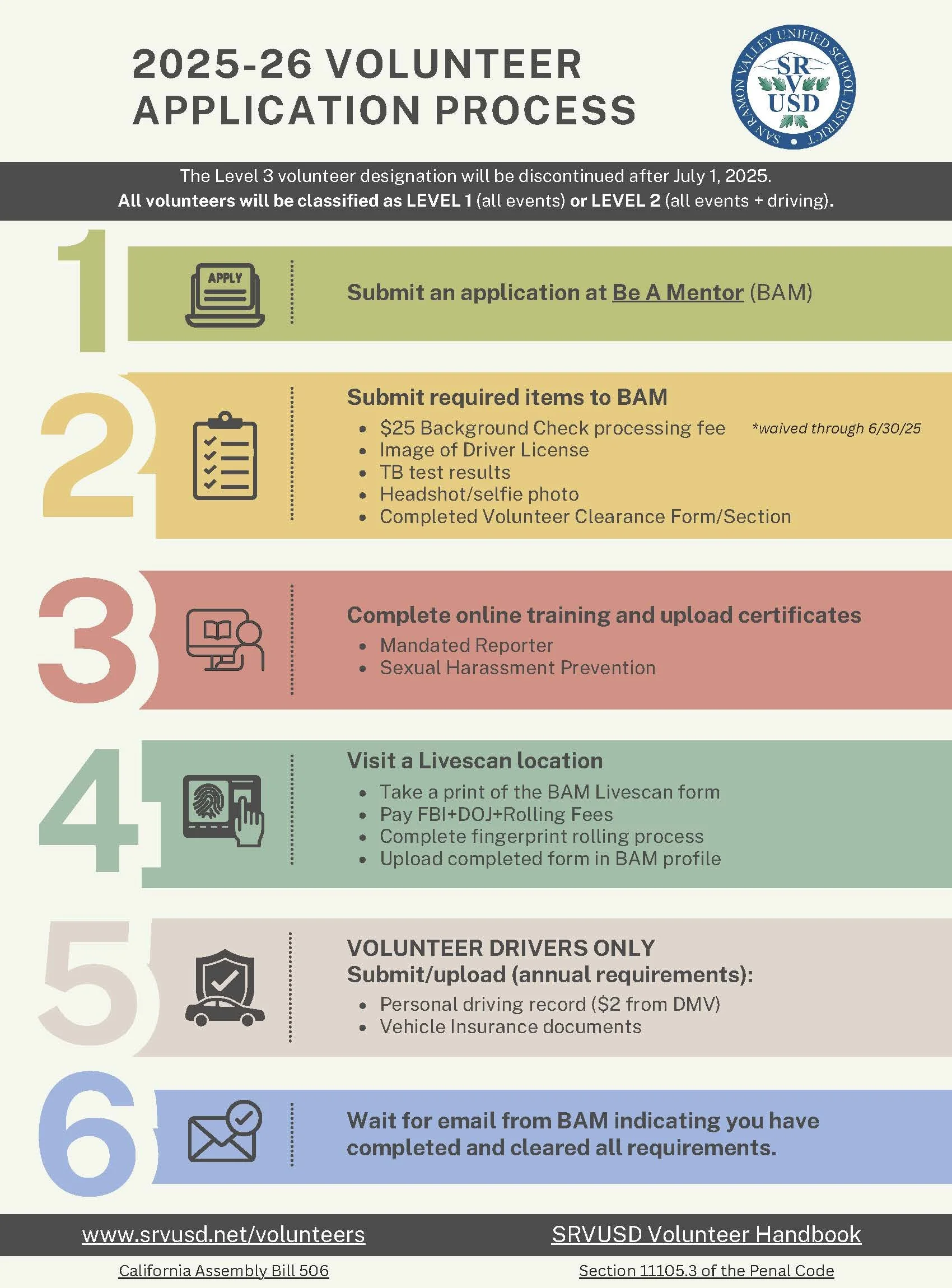 Beginning with the 2025–26 school year, all SRVUSD volunteers are required to complete a Livescan fingerprint background check and annual online training following California Assembly Bill 506.